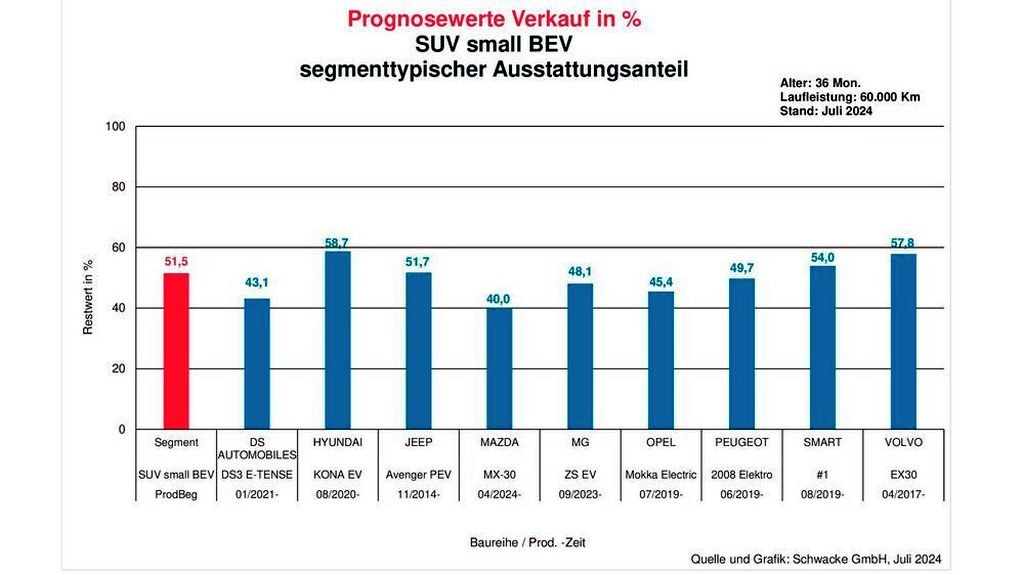 Na priloženi tabeli podjetja Schwacke lahko ugotovite, da bo priljubljeni modni 'šišmiš' (oblikovni križanec) znamke Mazda (model MX-30) po treh letih življenja in prevoženih 60.000 kilometrih vreden samo še 40 % njegove nabavne cene, najbolje pa v tem pogledu kaže južnokorejskemu 'SUV električarju' znamke Hyundai (model kona EV), ker bo v enakih okoliščinah precej bolje (po treh letih bo še vedno vreden 58,7 % nabavne cene …) ohranjal svojo vrednost. Te ugotovitve podpira tudi poročilo podjetja Vogel Research ter portala „kfz-betrieb“, kjer v teh dneh poročajo o novem bojkotu rabljenih električnih avtomobilov, ki so ga sprožili številni nemški trgovci z rabljenimi in novimi avtomobili, ob tem pa seveda omenjajo predvsem besedo 'Unverkäuflich!', ki označuje nekaj kar ne boste mogli prodati …