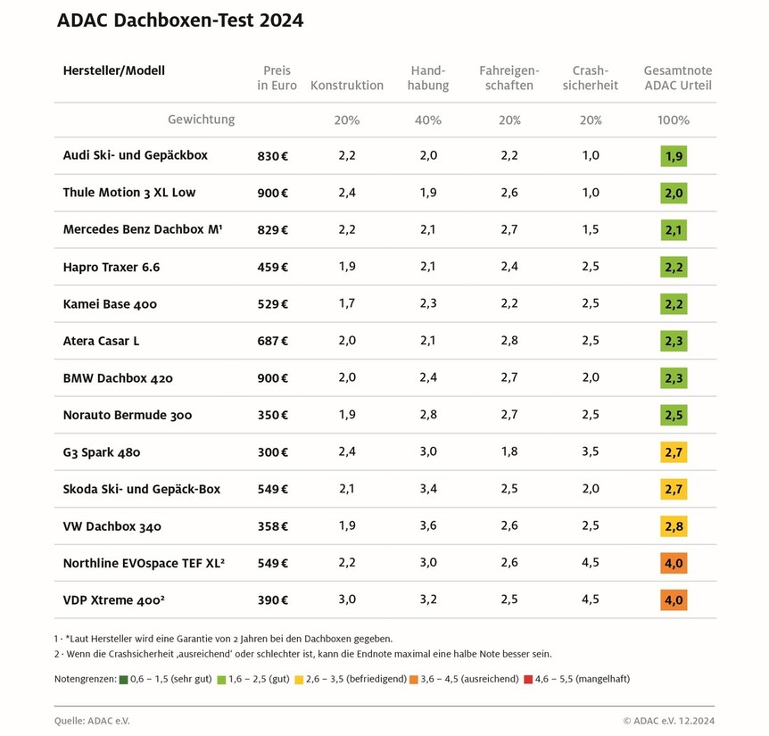 Izmed trinajstih tokrat testiranih strešnih kovčkov so Nemci tokrat našli samo 8 testnih kandidatov, ki so si na koncu prislužili oceno "gut" (dobro), trije so jo odnesli z oceno "befriedigend" (zadovoljujoče), dva izmed tokrat testiranih strešnih kovčkov pa sta si prislužila samo oceno "ausreichend" (zadostno). Nemci so bili tokrat najbolj navdušeni nad izdelkom znamke Audi (model 'Ski- und Gepäckbox'), ki v bistvu sploh ni izdelek te avtomobilske znamke, ker nastaja v obratih znamke Thule. Nemci mu zamerijo predvsem previsoko lastno težo (22,9 kg), če k temu prištejete še maso strešnih nosilcev (približno 5 kg), potem boste na streho vašega audija lahko namestili samo še 47, namesto deklariranih 75 kilogramov (deklarirana nosilnost strehe) tovora. Omenjajo pa tudi klasični 'marketinški nateg', ker vam proizvajalec strešnega kovčka ob tem govori o 430 litrih prtljažnega prostora. V resnici boste v takšen kovček stlačili samo za 400 litrov tovora. Poleg tega takšen strešni kovček ni ravno poceni (nemška prodajna cena: 830 evrov).