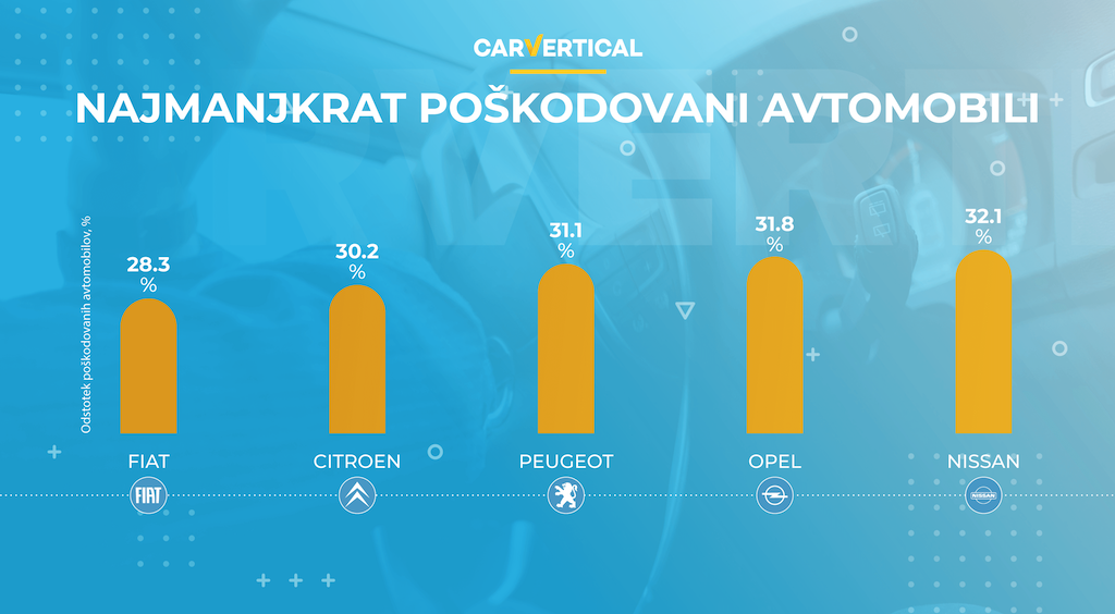 Vir podatkov: Raziskava temelji na poročilih o zgodovini avtomobilov, ki so jih pregledali uporabniki platforme carVertical. Ta platforma nudi podatke o zgodovini vozila z vnosom VIN številke, ki razkriva informacije o vsaki nezgodi, v katero je bilo vozilo vključeno, vse dele, ki so bili poškodovani ter koliko je vsako popravilo stalo in še več drugih informacij.
