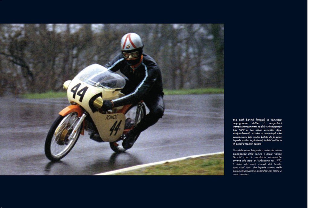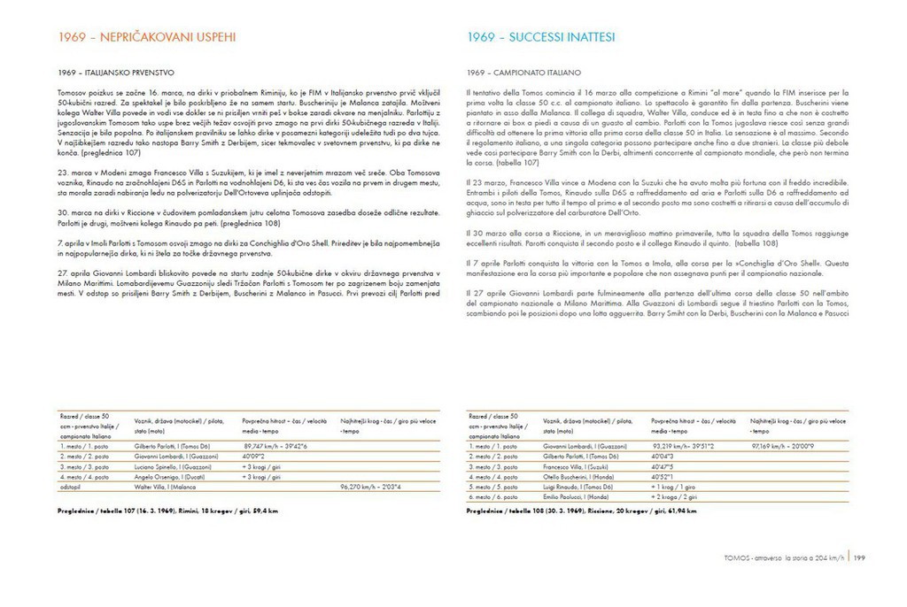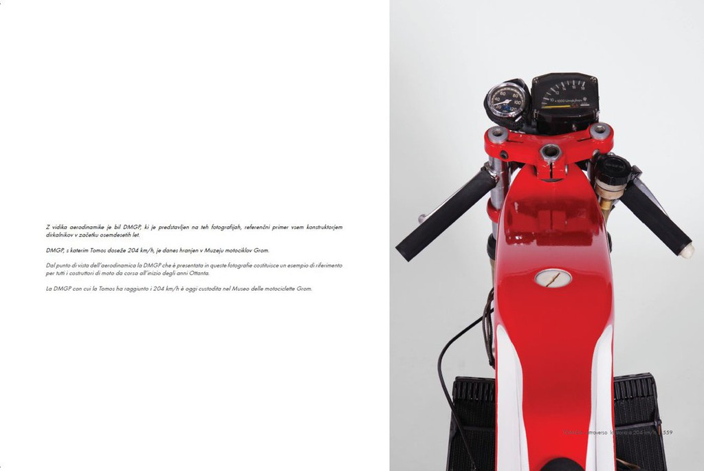 Avtor začne Tomosovo zgodbo o tekmovalni dejavnosti z letom 1956, ko Tomos edinkrat tekmuje uradno z motocikli višjih kubatur. Jedro knjige se prične z letom 1959, ko so prvič oblikovali tovarniško tekmovalno ekipo. Avtor opiše viške dosežkov svetovno priznanih in poznanih dirkačev (Gilberta Parlottija, Luigi Rinauda, Angelo Orseniga, Janka Štefeta, Adrijana Bernetiča, Zdravka Matulje ter mnogih drugih), vse do približno leta 1983, ko se Tomosova tekmovalna pravljica, z ukinitvojo tekmovalnega razreda, konča.