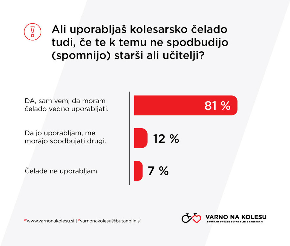 Pred nami so meseci, ki kličejo po preživljanju prostega časa na prostem. Na svoj račun bodo ponovno prišli ljubitelji kolesarjenja, ki se bodo s kolesom zapeljali v šolo ali službo ter uživali v kolesarskih izletih z družino in prijatelji. Program Varno na kolesu, ki ga organizira družba Butan plin s partnerji, letos že deseto leto zapored učence osnovnih šol spodbuja k varni in samostojni vključitvi v promet ter uporabi kolesa iz vidika trajnostne mobilnosti. Da bi raziskali, kakšno je znanje slovenskih kolesarjev o varnosti v prometu, so v sodelovanju s fundacijo Neurotrust za učence, njihove starše in učitelje pripravili anketo ter natančneje raziskali njihova stališča in prakse na področju prometne problematike.
