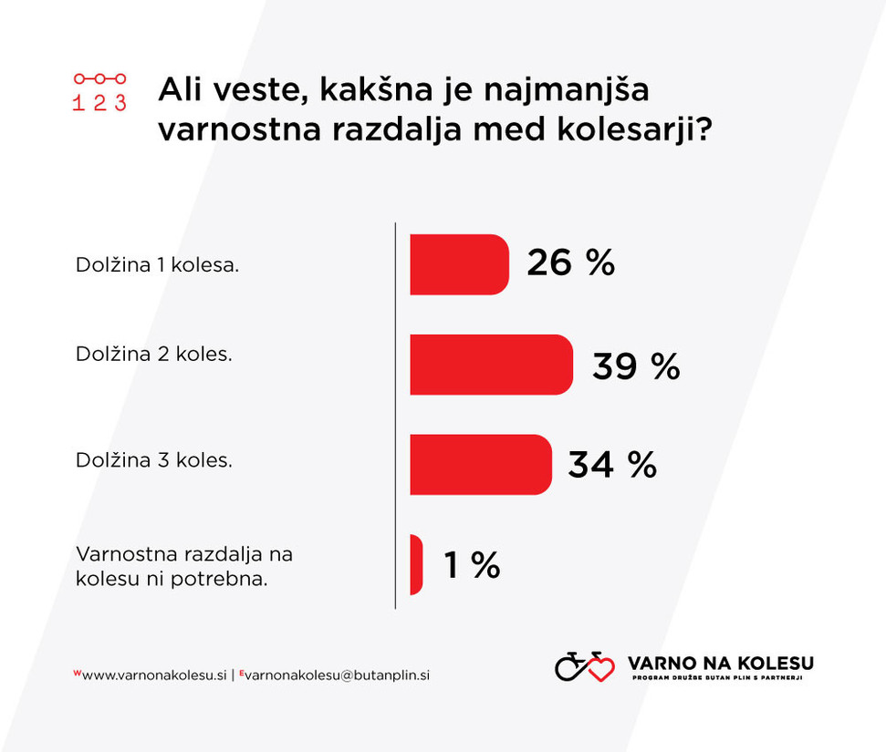 vprašanje, kolikšna je pravilna varnostna razdalja med kolesarji, kjer jih je večina zmotno ocenila, da ta namesto dolžini treh ustreza dolžini dveh koles.