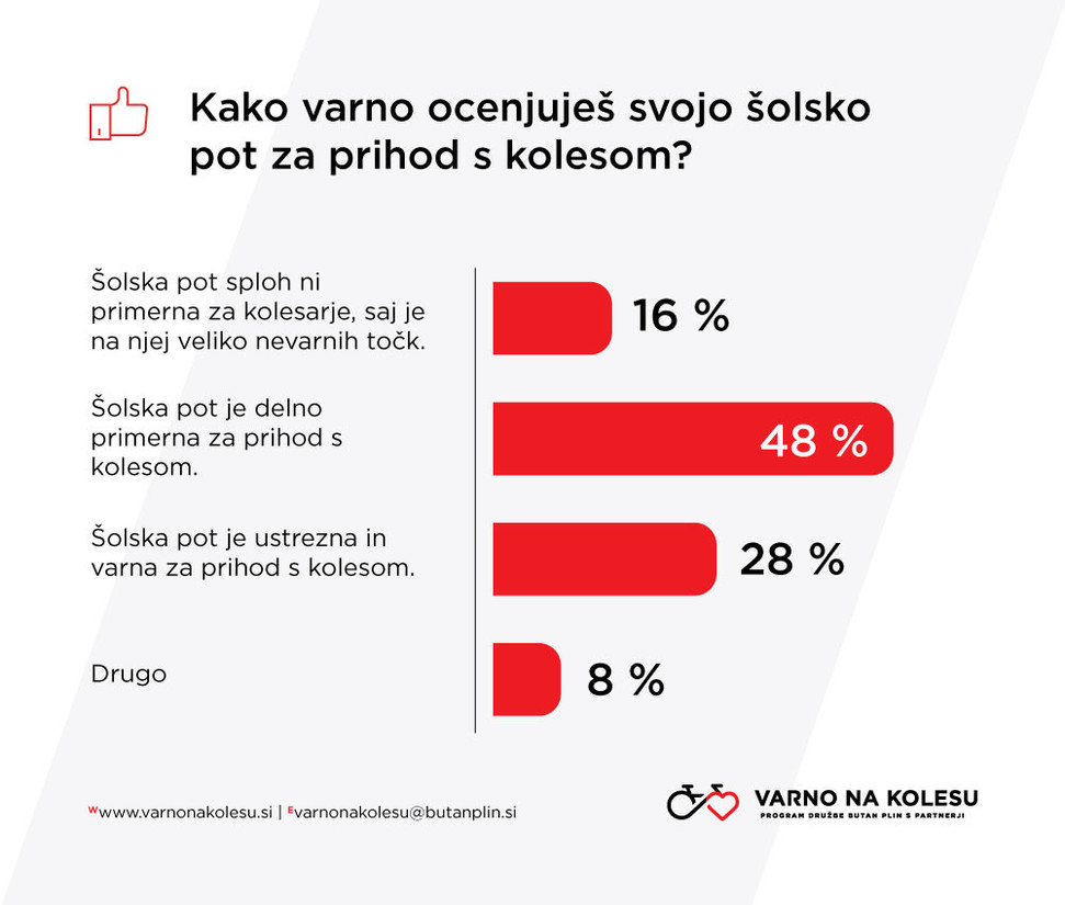 Po podatkih raziskave kolo zaenkrat ostaja rezervirano za rekreacijo in prosti čas. Le majhen je odstotek tistih, ki se s kolesom pripeljejo v šolo. Manj kot polovica jih sicer ocenjuje, da je šolska pot delno primerna za prihod s kolesom, kar je bistveno večji odstotek od tistih, ki šolsko pot za kolesarje ocenjuje za neprimerno in polno nevarnih točk. Vzpodbuden je podatek, da se po mnenju mladih kolesarjev dostopnost in urejenost kolesarske infrastrukture v Sloveniji izboljšuje.