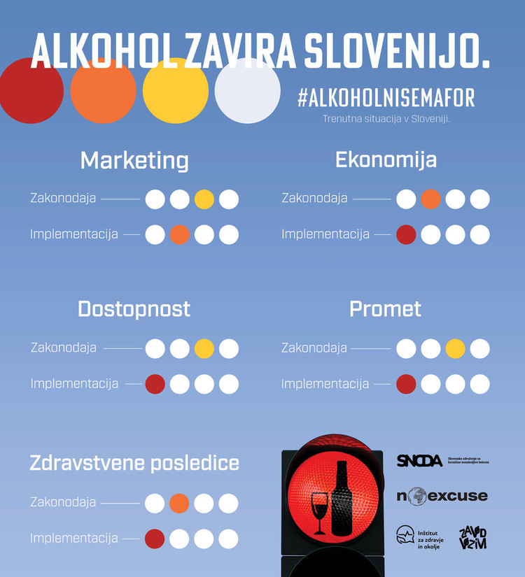 V Sloveniji imamo tako imenovano »mokro« kulturo, kar pomeni, da je alkohol v družbi sprejet kot nekaj normalnega, je del vsakdanjega življenja in običajev, hkrati pa je široko dostopen. Slovenci smo do pitja alkohola zelo nekritični in ga pogosto še spodbujamo, vse dokler se ne pokažejo resne posledice, kot so prometne nesreče, nasilje v družini, odvisnost … Kljub veliko govora o potrebnih spremembah na področju alkoholne politike, pa v zadnjih 10-ih letih na tem področju ni bilo bistvenih sprememb. Za razliko od tobaka, kjer so se naredili ogromni preskoki. Ker so pred vrati državnozborske volitve, na katerih bomo izbirali slovensko vlado za naslednja štiri leta, so se združili predstavniki organizacij, ki že več let aktivno delujejo na področju alkohola: Slovensko združenje za kronične nenalezljive bolezni (SNCDA), Mladinska zveza Brez izgovora Slovenija (No Excuse), Inštitut za zdravje in okolje (IZO) ter Zavod VOZIM. Slovenskim strankam, ki bodo na volitvah sodelovale, so poslali spletni vprašalnik ter jih pozvali, naj podajo svoja stališča, kako se nameravajo lotiti področja alkohola in na alkoholnem semaforju, ki trenutno gori rdeče, poskušajo spremeniti barvo njegove luči. Odzvalo se je 13 političnih strank (od 21-ih, ki bodo sodelovale na volitvah), po večini vse stranke, ki so doslej v parlamentu, ter nekaj novih.