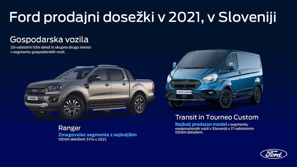 Da je Ford zelo močan pri lahkih gospodarskih vozilih, izkazujejo naslednji doseženi rezultati: v segmentu lahkih gospodarskih vozil je z 20-odstotnim tržnim deležem Ford zasedel drugo mesto in dosegel 18,4-odstotno rast prodaje v Sloveniji. V Evropi je Ford v segmentu gospodarskih vozil najboljši v prodaji in na prestolu že sedmo leto zapored, kar je izjemen dosežek. Zelo uspešni smo bili tudi pri prodaji poltovornjakov, kjer zasedamo prvo mesto tako v Evropi kot tudi v Sloveniji. Prodanih je bilo 344 Rangerjev, delež prodaje v segmentu znaša kar 31 odstotkov. Pri enoprostornih vozilih se je na vrh lestvice najbolje prodajanih prebil Ford Transit Custom s 17,3 % oziroma s 1442 prodanimi vozili. Na prvem mestu je kot najbolje prodajano enoprostorno vozilo tudi Tourneo Custom z 810 prodanimi vozili. Z izjemno priljubljenima modeloma Custom in Ranger pričakujemo uspešno prodajo in rast na slovenskem trgu tudi v prihodnje.