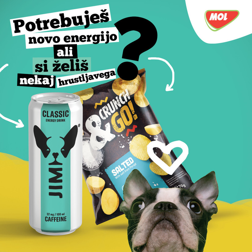 Stranke na vseh bencinskih servisih MOL po Sloveniji lahko uživajo v novi ponudbi izdelkov lastnih blagovnih znamk; Crunch&Go čipsu in energijski pijači JIM. Energijska pijača JIM je na voljo v klasični različici in različici brez aspartama ter sladkorja, medtem ko je čips Crunch&Go na voljo v štirih različnih okusih, in sicer v okusu s soljo, papriko ter čebulo in kislo smetano, pa tudi v različici lahkega krompirjevega čipsa z zmanjšano vsebnostjo maščob. Povsem nove izdelke lastne blagovne znamke, je Skupina MOL istočasno lansirala na ravni Skupine MOL v vseh državah v regiji na skupno približno 2.000 bencinskih servisih.