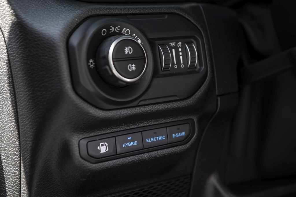 V načinu E-Save lahko voznik izbira med dvema funkcijama – varčevanjem z baterijo in polnjenjem baterije. Obe lahko vklopi na zaslonu sistema Uconnect: Vozniki lahko hibridni pogonski sistem in način vožnje modela Jeep Wrangler 4xe prilagodijo zahtevam posamezne poti – vsakodnevni popolnoma električni vožnji na delovno mesto, večernemu obisku mestnega središča ali tihemu raziskovanju narave po brezpotjih. Pogonski sistem vozila Wrangler 4xe ima tri načine delovanja, ki se imenujejo E-Selec. Voznik lahko želeni način pogonskega sistema izbira s tipkami na armaturni plošči na levi strani volana. • Hibridni način: To je privzeti način, ki združuje navor iz 2,0-litrskega bencinskega in električnih motorjev. V tem načinu pogonski sistem najprej uporabi moč baterije. Ko stanje napolnjenosti baterije pade na minimalno raven ali voznik zahteva več navora, uporabi moč 2,0-litrskega motorja I-4 s turbopolnilnikom. • Električni način: Motor deluje na električni pogon brez emisij. Ko stanje napolnjenosti baterije pade na minimalno raven ali voznik zahteva največji navor (na primer popolnoma pritisne stopalko za plin), se vklopi 2,0-litrski motor. Če je stanje napolnjenosti baterije na najnižji ravni, se sistem samodejno preklopi v hibridni način. • Način E-Save: Pri tem načinu ima prednost pogon 2,0-litrskega motorja. Vozilo tako varčuje z baterijo za poznejšo uporabo, na primer za popolnoma električno vožnjo po brezpotjih ali mestnih območjih.