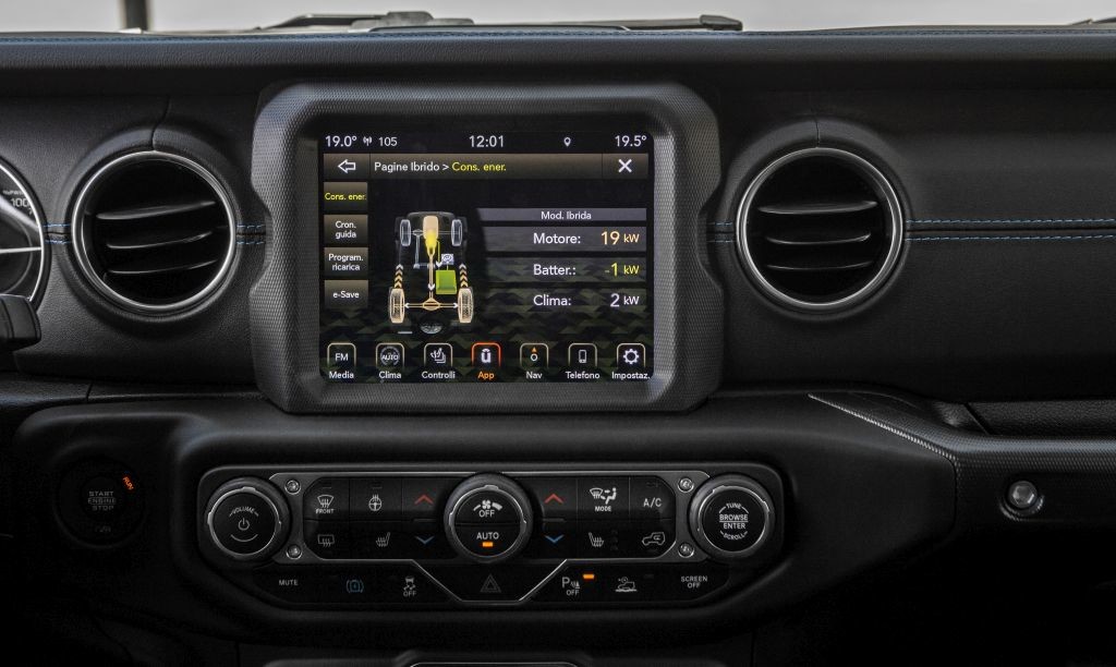 Za pomoč pri optimiziranju prednosti načinov E-Selec je na zaslonu sistema Uconnect v vozilu Wrangler 4xe aplikacija Hybrid Pages. Z njo lahko lastniki spremljajo tok energije in preverjajo učinek regenerativnega zaviranja, načrtujejo urnik polnjenja za izkoriščanje nižjih cen elektrike ter si ogledajo zgodovino vožnje s podrobnostmi o porabi elektrike in bencina.