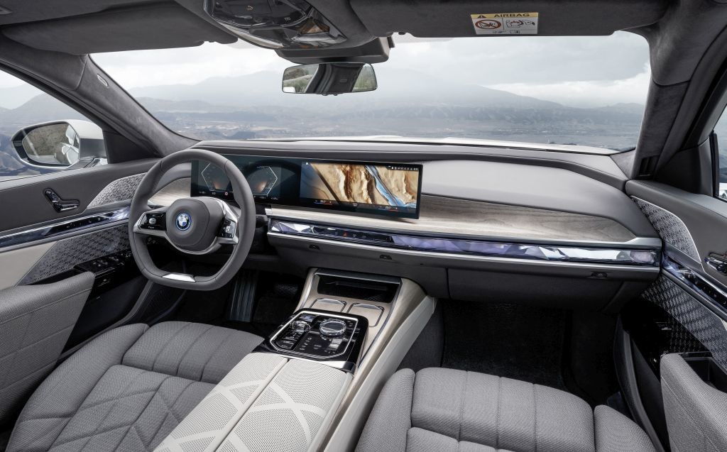 pretakanje vsebin glede na posamezne države in ponudbo razvedrila na Kitajskem. Antenski sistem, združljiv s 5G, zagotavlja optimizirano povezljivost. Nova interpretacija znanega oblikovanja k vozniku usmerjenih BMW kabin z ukrivljenim zaslonom BMW. 12,3-palčna instrumentna plošča in 14,9-palčni nadzorni prikazovalnik pod enotnim steklom sta ukrivljena proti vozniku. Vizualno učinkovito sta nameščena na notranji okrasni okvir iz lesa z odprtoporno strukturo ali iz karbona, odvisno od