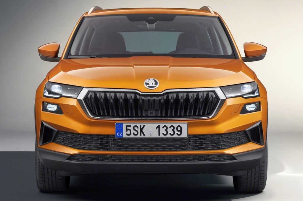 Prav do Škodine mreže hladilnika segata zdaj občutno vitkejša sprednja žarometa. Dinamično podobo poudarjajo tudi nove dnevne luči, ki so zdaj deljene. Pri opcijski najbolj izpopolnjeni različici sprednjih žarometov je prvič v Karoqu na voljo celostna matrična LED-tehnologija. V žarometih sta drug nad drugim nameščena po dva LED-modula. Oba sta odgovorna za zasenčene in dolge luči ter posebno v načinu zasenčenih luči v temi ustvarja markantno 'štirioko' grafično podobo. Pri standardni izvedbi