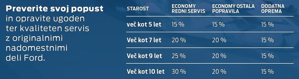 Ker se zavedamo, da se lastništvo vozila ne konča z nakupom vozila, smo za vas pripravili ECONOMY SERVIS 5+ - poseben program vzdrževanja in servisiranja za vozila Ford, starejša od petih let, s popusti vse do 30 odstotkov. Starejša vozila potrebujejo več nege in pozornosti, da ohranjajo varnost in zanesljivost. ECONOMY SERVIS 5+ nudi popolno, visokokakovostno storitev po dostopni ceni. Tako za osebna kot za gospodarska vozila Ford.