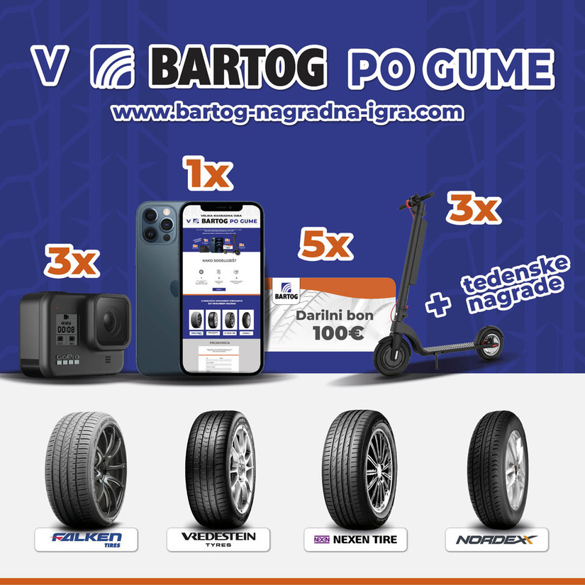 Nepredvidljive vremenske razmere, ki smo jim priča v zadnjem času, so marsikoga odvrnile od obiska pri vulkanizerju in menjavo pnevmatik smo se mnogi odločili prestaviti na teden ali dva kasneje. Kdor še ni opravil menjave, bo prijetno presenečen nad veliko nagradno igro podjetja Bartog. Z nakupom štirih pnevmatik znamk Falken, Nexen, Nordexx ali Vredestein v eni izmed 40-ih poslovalnic podjetja Bartog se potegujete za veliko nagrad, ki jih bodo izžrebali vsak teden! Prejmete lahko telefon Apple Iphone 13 128 GB, kamero GoPro Hero8 in električni skiro Scooty X8. Podarjajo tudi darilne bone in druge nagrade, ki vsem rišejo nasmeh na obraz.