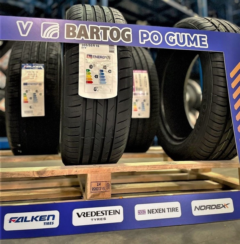 majhnim profilom – dezenom, drastično zmanjšane in zelo nevarne za vožnjo, saj predstavljajo izjemno tveganje za slab oprijem in zdrs vozila. Pnevmatike znamk Falken, Nexen, Nordexx in Vredestein so opremljene z ustreznimi nalepkami EU za označevanje izkoristka goriva, oprijema na mokri podlagi in hrupnosti pnevmatike. Nakup pnevmatik za sodelovanje v nagradni igri lahko opravite v spletni trgovini podjetja Bartog, kjer zagotavljajo ugodne