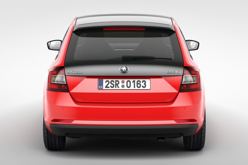 Zadek ima zasnovo, s katero športni značaj novega modela Rapid Spaceback postane še izrazitejši. Zanj so značilne čiste linije, dizajn je uravnotežen in prečiščen. Črn difuzor še močneje postavlja v ospredje vodoravne linije in poudarja širino zadnjih luči, ki imajo značilno zasnovo v obliki črke C. Dizajn sprednjega dela se do B-stebrička zgleduje po limuzinski različici Rapida. Ključni elementi so: markantna mreža hladilnika z 19 navpičnimi lamelami in kromiranim okvirom, nov logotip na zaobljenem sprednjem zaključku pokrova prtljažnika, žarometas postavitvijo elementov v obliki deteljice in meglenki.