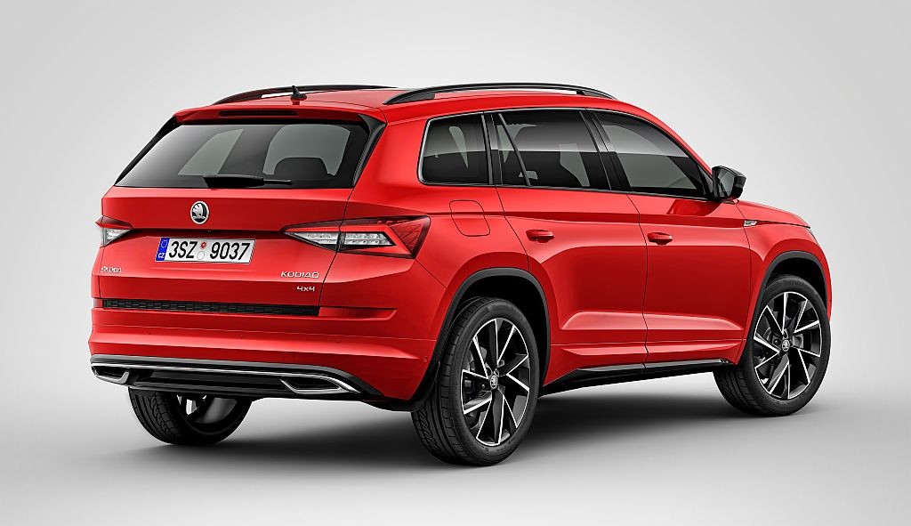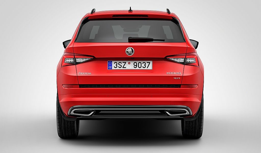 Škoda Kodiaq Sportline svoj dinamičen značaj izraža s črnimi elementi karoserije in specifičnimi elementi opreme. Mreža hladilnika, strešne letve, ohišji zunanjih ogledal in obrobe stranskih stekel so v črni barvi. Zadnja stranska stekla in zadnje steklo so zatemnjena (SunSet). Oblikovno zasnovo zadka zaokroža ozka srebrna letev pod odbijačem.
