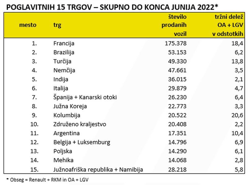 Izven Evrope je Renault na ključnih trgih okrepil svoj položaj. V prvem polletju 2022 je prodaja izven Evrope predstavljala 42,2-odstoten delež vse prodaje (brez Rusije). V Turčiji, ki je postala tretji najpomembnejši trg, je prodaja v primerjavi s prvim polletjem 2021zrasla za 20 odstotkov, tržni delež pa se je v enaki primerjavi povečal za 3,4 odstotne točke zahvaljujoč uspešnosti modela Clio. Renault je vodilna znamka na turškem trgu osebnih avtomobilov. Renault svojo zeleno ofenzivo širi po vsem svetu: v Latinski Ameriki je z uspehom začel sprejemati prednaročila za model Kwid E-Tech. Dobave bodo stekle na začetku septembra.