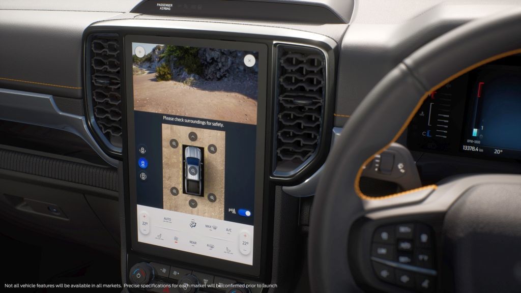 Številni tradicionalni gumbi za upravljanje načina vožnje so se z armaturne plošče in sredinske konzole preselili na poseben prikaz na zaslonu SYNC™. Z enim pritiskom na gumb lahko vozniki preidejo na Rangerjev namenski zaslon za vse terenske in vozne načine, kjer lahko spremljajo pogonski sklop, kot krmiljenja, kote nagiba in naklona vozila ter druge kontrolne elemente. Zaslon je povezan tudi s 360-stopinjsko kamero,7 ki omogoča preprosto parkiranje v utesnjenih mestnih prostorih ali pomaga pri premagovanju posebej zahtevnega terena med raziskovanjem. Poleg tega lahko kupci prek zaslona na dotik ali aplikacije FordPass upravljajo Rangerjev novi sistem zunanje osvetlitve, kar pomeni, da jim ni treba delati, kampirati ali kar koli početi v temi. Rangerjeva tehnologija je obenem pripravljena na prihodnost, saj vgrajeni modem FordPass Connect omogoča brezžične posodobitve programske opreme Ford Power-Up.