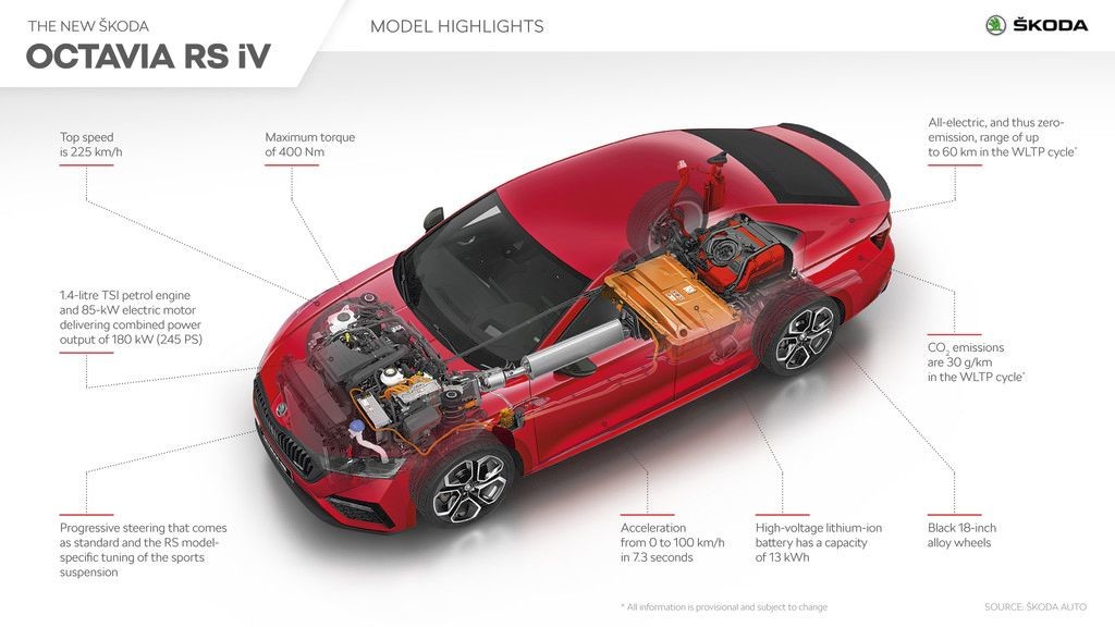 Škoda pri modelu Octavia RS iV kombinira 1,4-litrski bencinski motor TSI z močjo 110 kW (150 KM) in 85-kilovatni elektromotor. Oba skupaj zagotavljata sistemsko moč 180 kW (245 KM), največji navor 400 Nm pa se prek 6‑stopenjskega menjalnika DSG prenaša na sprednji kolesni par. Izpust CO2 znaša okrog 30 g/km (po kriterijih WLTP)*, s čimer vozilo že zdaj izpolnjuje novi, strožji emisijski standard EU6d, ki bo za vsa novo registrirana vozila v Evropi postal obvezen 1. januarja 2021. Litij-ionska visokonapetostna baterija s celično kapaciteto 37 Ah in energijsko vrednostjo 13 kWh omogoča električni doseg do 60 kilometrov (po kriterijih WLTP). 330 Nm navora, ki je pri elektromotorju na voljo že takoj po zagonu, omogoča energično speljevanje. V športnem režimu vožnje, ko je na voljo polna sistemska moč, lahko Octavia RS iV od 0 do 100 km/h pospeši v 7,3 sekunde. Končna hitrost znaša 225 km/h. Za dinamične vozne lastnosti skrbita serijsko progresivno krmiljenje in značilno dinamična nastavitev športnega podvozja.