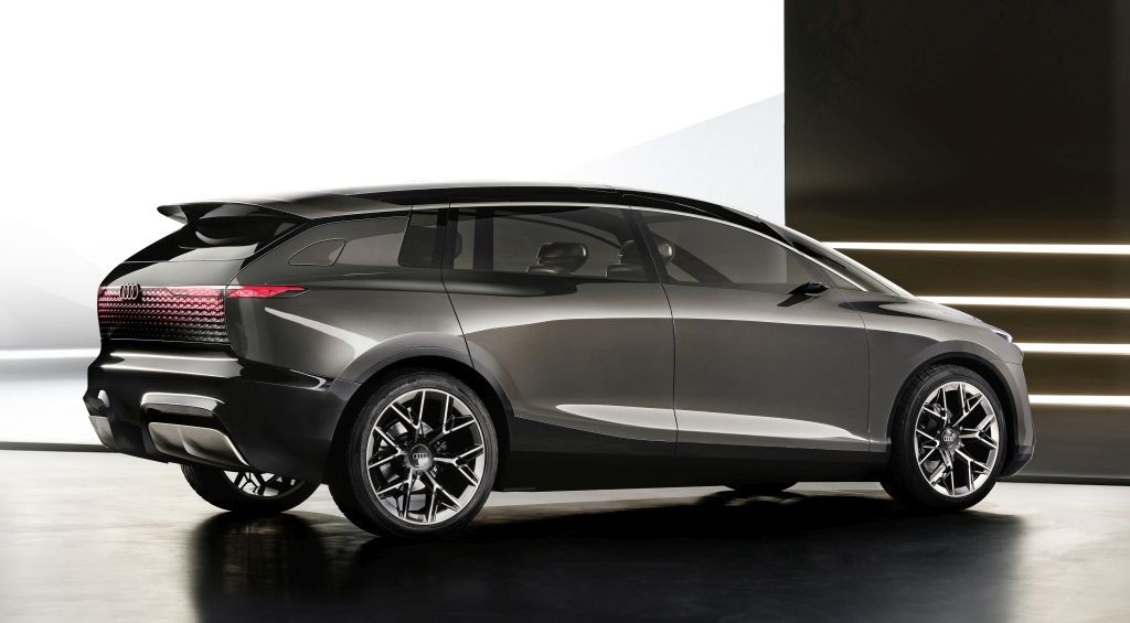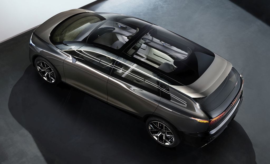 V tekoči silhueti karoserije najdemo klasične Audijeve oblike in elemente, ki pa so tu povezani v novo sintezo: reprezentativni enodelni okvir z digitalnimi očesi svetlobnih enot. Pri pogledu s strani vidimo široko usločen, dinamičen strešni lok. Masiven prag, za katerim se skriva baterija. Velika 24-palčna platišča, ki povzemajo ikono 90. let – konceptno vozilo Audi Avus. Šest dvojnih krakov odraža lahko gradnjo in stabilnost ter obenem spominja na funkcionalna platišča za motošport in Bauhaus tradicijo znamkinega oblikovanja. Nakazano klinasto obliko avtomobilskega trupa poudarja veliko, izrazito položno vetrobransko steklo. Na sprednjem in zadnjem delu boste našli velike digitalne svetlobne površine, ki poudarjajo dizajn vozila in obenem služijo kot komunikacijski elementi.