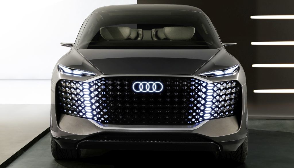 Na sprednjem delu je inovativna interpretacija Audijevega enodelnega okvirja: oblikovan je kot velik osmerokotnik. Čeprav je mreža hladilnika izgubila svojo prvotno funkcijo kot odprtina za zajem zraka pri električnem pogonu, še vedno ostaja edinstveni simbol znamke. Digitalna svetlobna površina se skriva za rahlo zatemnjenim prozornim vizirjem, ki pokriva veliko površino na sprednjem delu. Sama tridimenzionalna svetlobna struktura je razporejena v dinamično zgoščenih območjih pikslov.