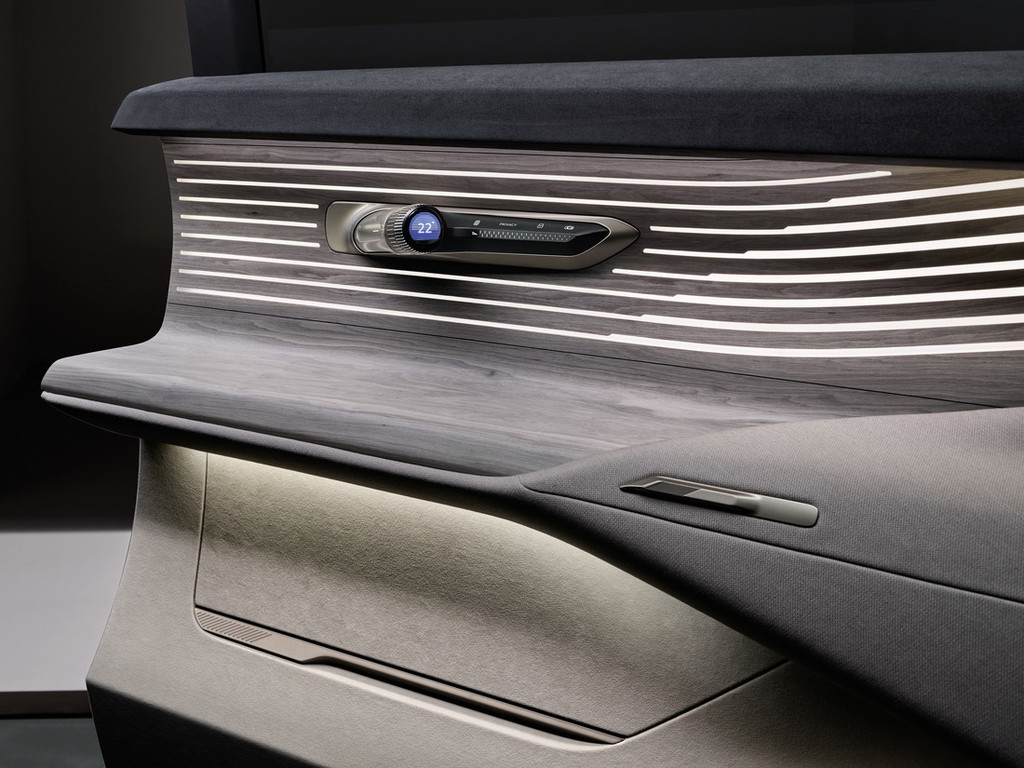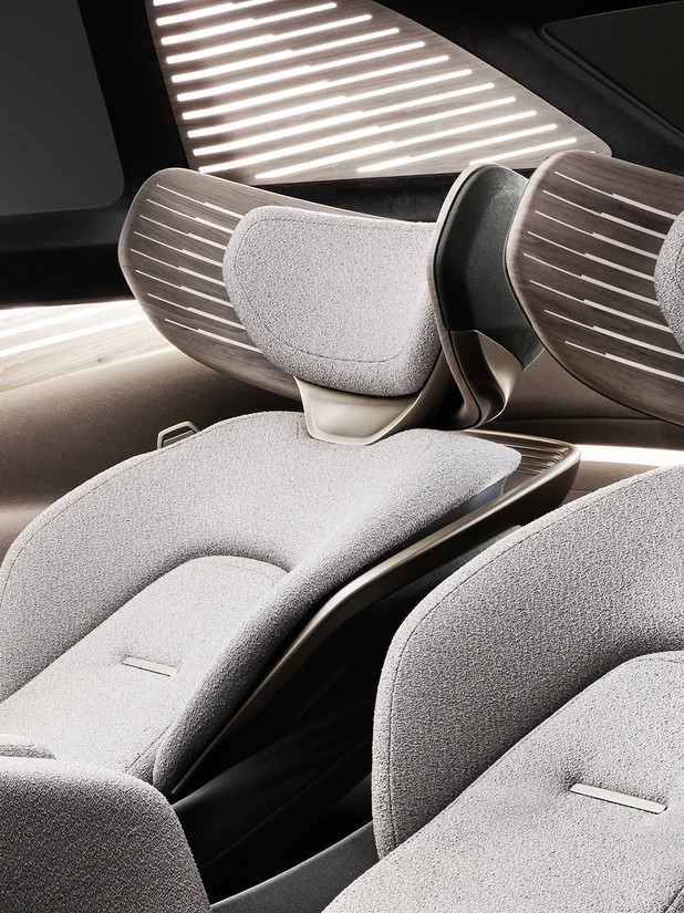 Nežni odtenki bež in sive barve vodoravno strukturirajo notranjost. Umirjena temno zelena barva školjkastih sedežev pomirja oči. Barvna območja notranjosti postajajo svetlejša od zgoraj navzdol in skupaj z naravno svetlobo ustvarjajo homogeno, prostorno notranjost. Presenetljivo je, kako vozilo zaživi ob enostavnem dotiku s prstom: ima prikaze, sicer v obliki projekcij na lesene površine pod vetrobranskim steklom, ki so glede na vozno stanje – ročno z volanom ali 4. stopnja – razporejeni po celotni širini notranjosti ali ločeno segmentirani za voznika in sovoznika.