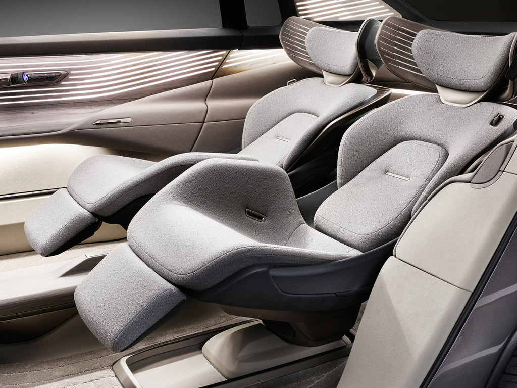 Sedišče in naslonjalo sedežev z integriranimi pasovi sta na pogled ločena drug od drugega. Med zadnjima sedežema, ki sta običajno fiksirana v nižjem položaju, je sredinska konzola, ki jo je mogoče pomakniti navzgor. Ima avtomat za vodo in kozarce – še en dokaz, da je koncept Audi urbansphere prvorazreden. Koncept Audi urbansphere je mesto dobrega počutja tudi zaradi inovativnih digitalnih možnosti, ki so se v veliki meri pojavile v procesu soustvarjanja s kitajskimi strankami. Odličen primer je zaznavanje stresa – ta učljivi program s skeniranjem obraza in analizo glasu ugotavlja, kako se potniki počutijo, ter vsaki osebi nudi prilagojene možnosti za sprostitev, na primer z aplikacijo za meditacijo, ki jo je mogoče uporabljati prek osebnega zaslona in zasebne zvočne cone v vzglavnikih.