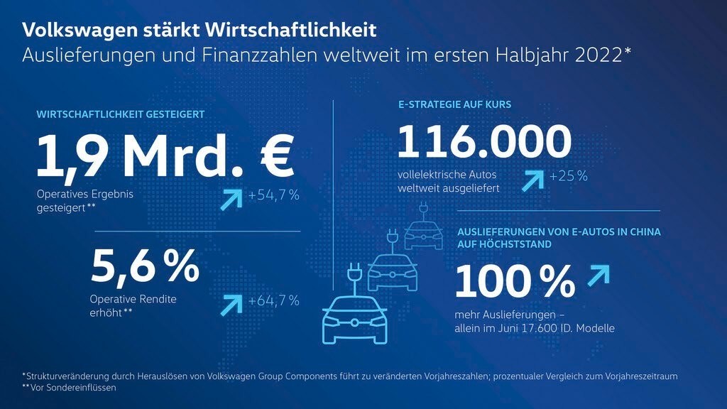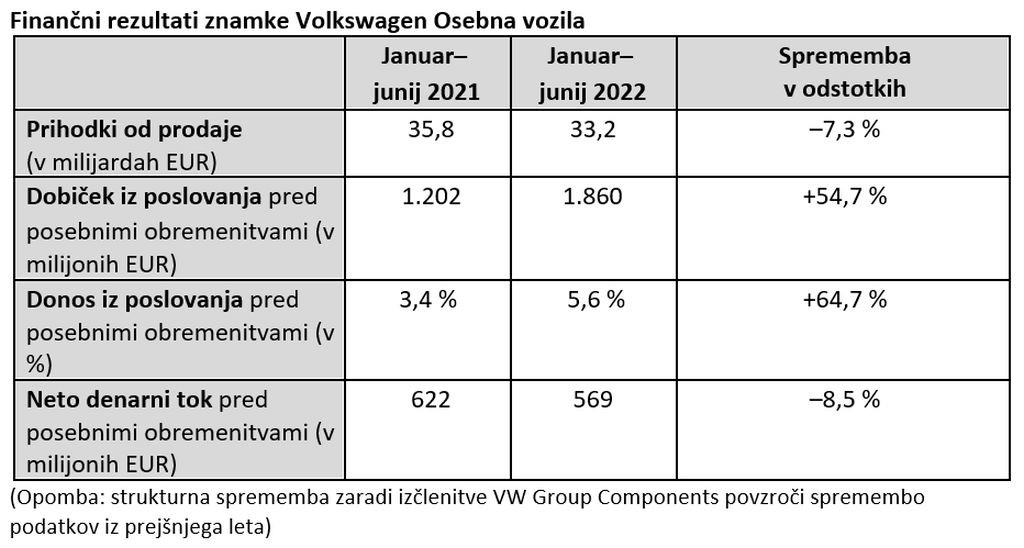 Znamka Volkswagen je v prvem polletju 2022 še okrepila svojo dobičkonosnost. Učinkovito upravljanje prodaje, izboljšana stroškovna učinkovitost in sistematično izvajanje strategije ACCELERATE so omogočili dober finančni rezultat. Dobiček iz poslovanja pred posebnimi obremenitvami se je povečal na 1,9 milijarde evrov (1. polletje 2021: 1,2 milijarde evrov). Donos iz poslovanja pred posebnimi obremenitvami se je dvignil na 5,6 odstotka (1. polletje 2021: 3,4 odstotka). K polletnemu rezultatu je prispevalo predvsem uspešno drugo četrtletje. To je tudi glavni razlog, da je neto denarni tok iz poslovanja v prvih šestih mesecih dosegel 569 milijonov evrov. Zaradi optimizirane modelske in cenovne politike je podjetje doseglo promet v višini nekaj manj kot 33 milijard evrov (1. polletje 2021: 36 milijard evrov) – kljub bistveno manjšemu številu dobavljenih vozil v primerjavi z lanskim letom.