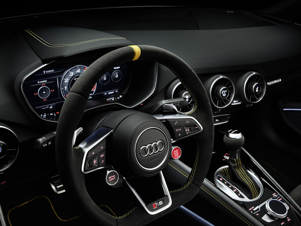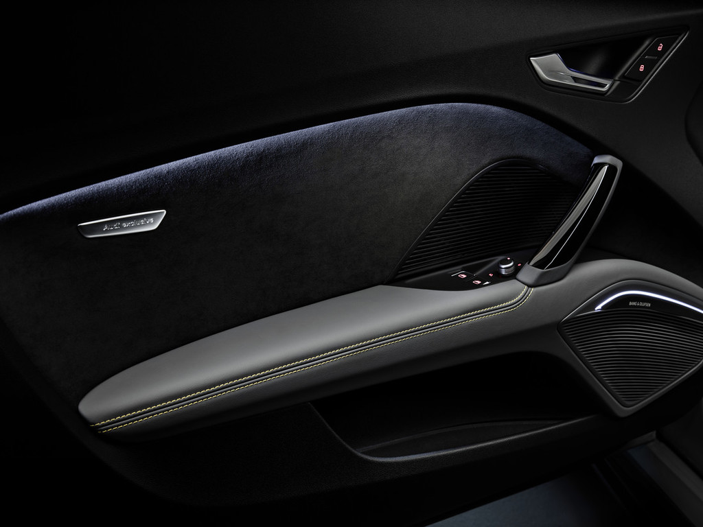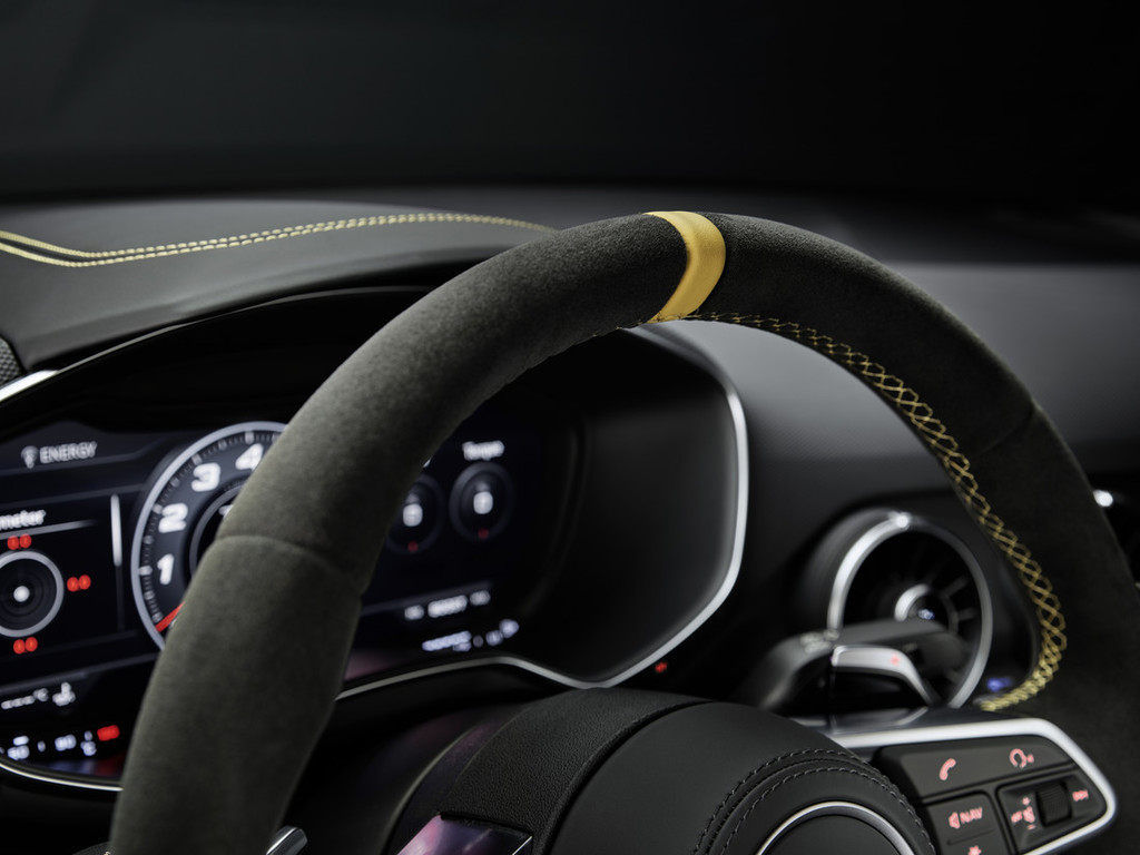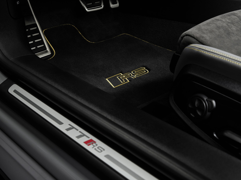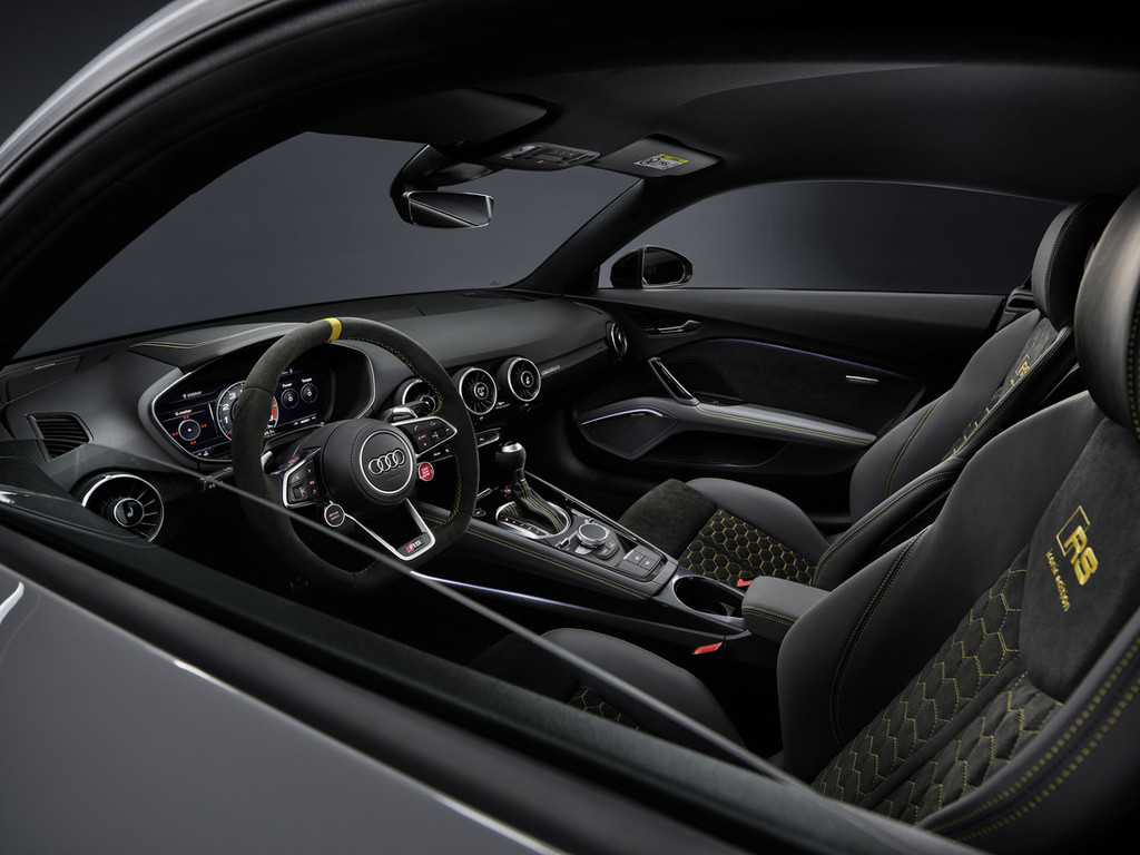 Notranjost modela TT RS Coupé iconic edition* popolnoma zaznamujeta ekskluzivnost in ljubezen do detajlov. Temna barvna shema notranjosti tudi tukaj tvori osrednji motiv, ki pa ga še dodatno poudarjajo premišljene podrobnosti iz programa Audi exclusive. Dvobarvni športni sedeži RS imajo stranice sedežev iz finega napa v premogovo sivi barvi, medtem ko je sredinski del sedežev iz alkantare prešit s satastim vzorcem v ognjičevo rumeni barvi. Na višini ramen črno alkantaro krasi ekskluzivno