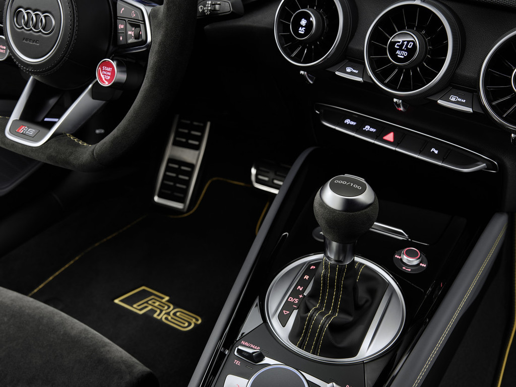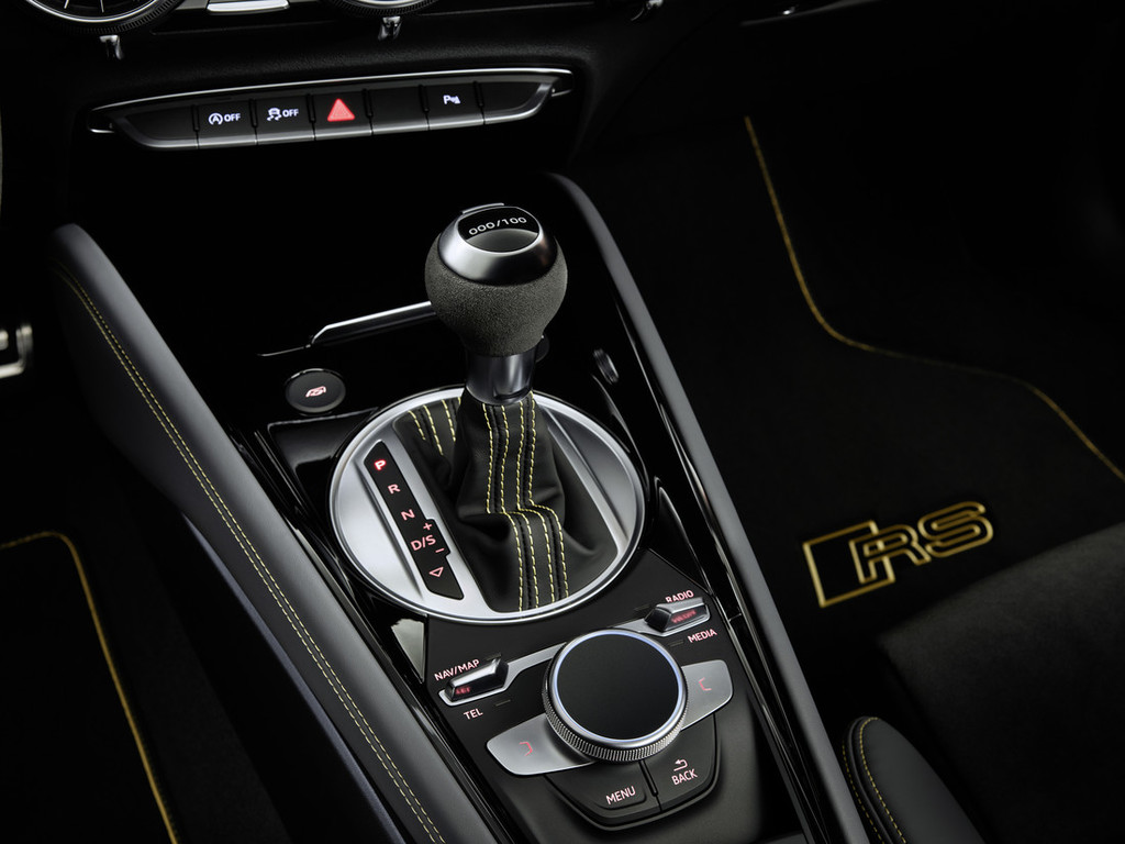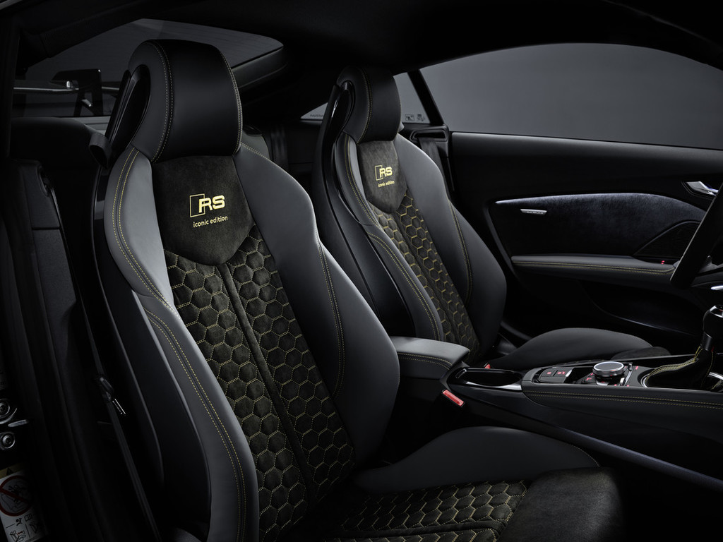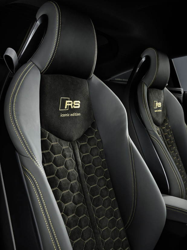 izvezen napis 'iconic edition'. Tudi črni predpražniki so oplemeniteni z vezenino RS v ognjičevo rumeni barvi. Sredinska konzola in vratni nasloni za roke so v premogovo sivi barvi s kontrastnimi šivi v ognjičevo rumeni – enak vzorec pa se nadaljuje tudi na črnem ščitniku prikazovalnika Audi virtual cockpit. Na vratnih oblogah in na športnem usnjenem volanu RS z ognjičevo rumeno oznako na sredini zgoraj, bodo stranke zatipale črno alkantaro. Izbirno ročico pa zaznamuje individualnost: z