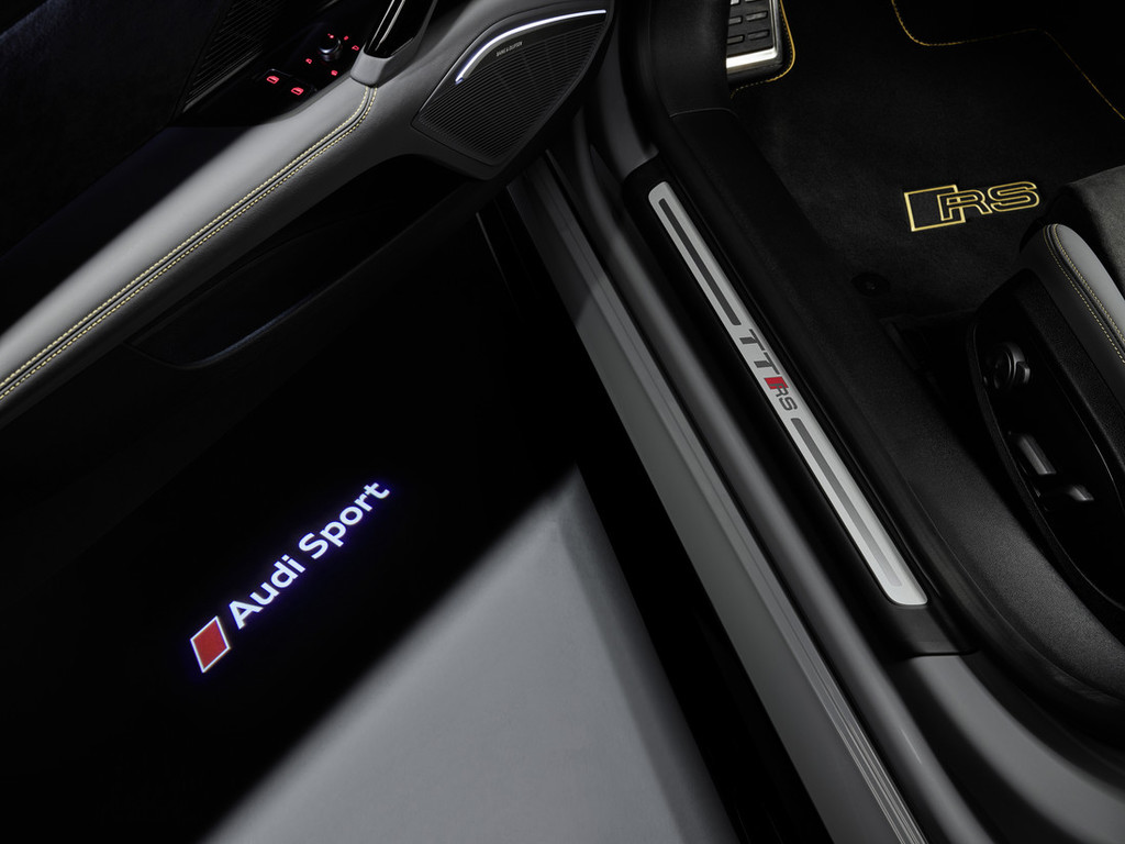 nadaljuje z bleščeče črno mrežo hladilnika z matiranim črnim enodelnim okvirom, ki odlično poudarja napis quattro v videzu matiranega titana. Model RS se samozavestno ponaša z vstavki v stranskih pragovih v črni sijajni barvi, ta pa je dosledno uporabljena tudi pri Audijevih krogih in oznaki modela TT RS na sprednjem in zadnjem delu ter na ohišjih zunanjih ogledal. Elegantna in za to serijo ekskluzivna bleščeče črna 20-palčna aluminijasta platišča s 7 kraki z ujemajočimi črno lakiranimi