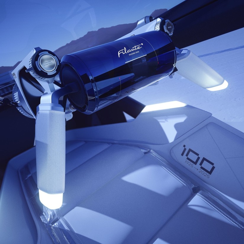 des Records), okrovi koles (Etoile Filante), šilasta maska, položaj kabine in jermen za nastavljanje sedeža (40 CV des Records). Vse te oblike in deli nas spominjajo na preteklost in se popolnoma zlivajo z modernostjo Filante Record 2025. Skladno se zlivajo s futurističnim videzom vozila in tako ustvarjajo naravni dvogovor med preteklostjo in prihodnostjo.