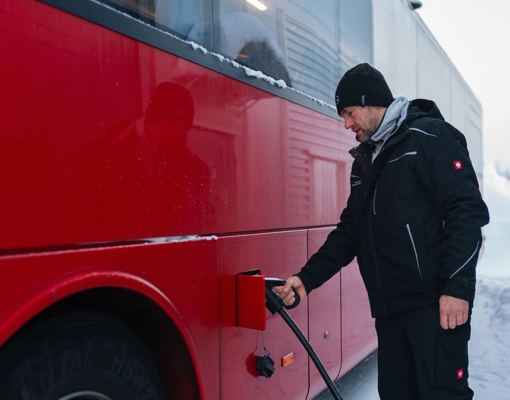 Leinfelden-Echterdingen – Avtobusna podjetja postavljajo enake zahteve za avtobuse na električni pogon kot za tovrstna vozila s konvencionalnimi dizelskimi motorji. Tudi v težkih vremenskih razmerah, kot so mraz, led in sneg, morajo vozila zanesljivo opravljati svoje delo. Glede na to so se aktualna testiranja za zimske razmere dveh predserijskih prototipov avtobusa Mercedes-Benz eIntouro v Rovaniemiju na Finskem znova izkazala za pomembne preizkuse vzdržljivosti. Ekipa razvojnih in testnih inženirjev je prvi medkrajevni avtobus na akumulatorski električni pogon družbe Daimler Buses testirala v izjemnih podnebnih razmerah, na primer na zasneženem in poledenelem vozišču, pri močnem vetru in temperaturah do minus 30 stopinj, da bi na podlagi tega določila ukrepe za nadaljnjo optimizacijo. Vsi novi tipi avtobusov družbe Daimler Buses so pred začetkom serijske proizvodnje podvrženi obsežnim rutinam testiranja, ki vključujejo varnostne preizkuse, test obremenitve in tudi testne vožnje pri izjemno visokih in nizkih temperaturah.