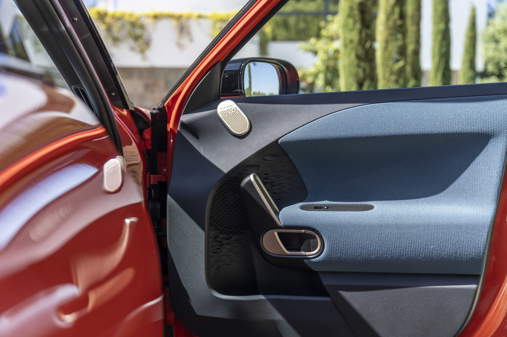 Nežen, zaobljen oblikovalski stil notranjosti se odraža tudi v ukrivljenih površinah armaturne plošče: površina le-te je prekrita s pletenino, pri kateri spodnja barva sije skozi zgornjo. To daje notranjosti domačen značaj z močno poudarjenimi barvnimi kontrasti. Vsestranska struktura, ki je enostavna za vzdrževanje in se razteza še na oblogo notranjih vrat, je narejena iz recikliranega poliestra. Visokokakovostno opremo v kabini zaokrožujejo udobni sedeži, opcijsko s tekstilno površino ali iz perforiranega Vescina. Dokaj velik zadnji del vozila nudi prostor za tri potnike. Z zložljivim naslonjalom zadnjih sedežev v razmerju 60 : 40 se lahko prtljažni prostor po potrebi poveča s 300 litrov na do 1005 litrov.