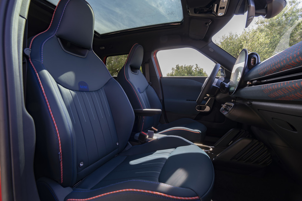 Pri ravni Favoured Trim je notranjost zelo ekspresivna. Armaturna plošča je v elegantni barvi Dark Petrol, ki jo dopolnjuje poudarjen oranžni barvni gradient na sovoznikovi strani. Ta dinamični videz se prav tako odraža v športnih sedežih, narejenih iz perforiranega Vescina. Ti so na voljo s tradicionalnim poudarjenim šivom in z vezanim logotipom MINI v dveh barvah. JCW Trim predstavlja vsestranski materialni koncept MINI Acemana v maksimalno športnem stilu. JCW sedež s športno geometrijo sedeža in z dodatnimi stranskimi oporami opazno izboljša udobje. Skupaj z večbarvnim pletenim tekstilom in črnim sintetičnim usnjem z rdečimi šivi je ta barvni koncept skladen z izvedbo armaturne plošče in vratnih oblog.
