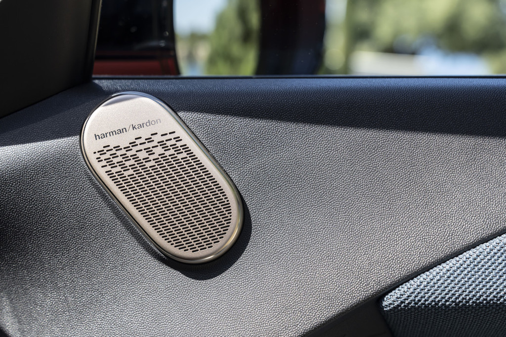 znamke v našo sedanjost. Prostorna notranjost vrat, udobne mere v ramenskem predelu in dokaj veliko prostora za noge dajejo svetli kabini odprto vzdušje s širokimi merami, medtem ko panoramska steklena streha ta učinek poveča z dodatno svetlobo od zgoraj. V temi ambientna osvetlitev na strešni ploskvi ustvari posebno vzdušje v notranjosti glede na izbrani način osvetlitve. Prostostoječi ročaji vrat in pokrovi zvočnikov v novi barvi Vibrant Silver so poravnani diagonalno in ustvarjajo