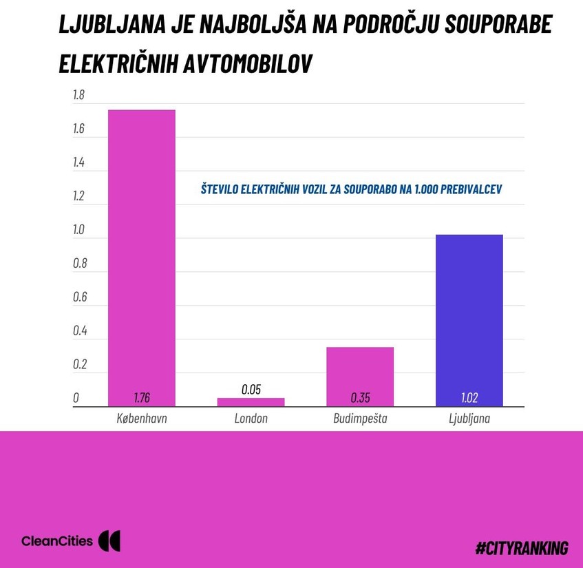 Zahvaljujoč dobrim rezultatom pri omogočanju souporabe električnih avtomobilov in nameščanju polnilnih mest za električna vozila se je Ljubljana na lestvici uvrstila višje od mest, kot so Madrid, Rim, Bruselj in Stockholm. V Ljubljani je na voljo 1,02 električnega vozila za souporabo na 1.000 prebivalcev, s čimer se slovenska prestolnica uvršča na tretje mesto med vsemi 42 mesti. Vodilni København ima 1,76 električnega vozila za souporabo na 1.000 prebivalcev, več mest, na primer Liège