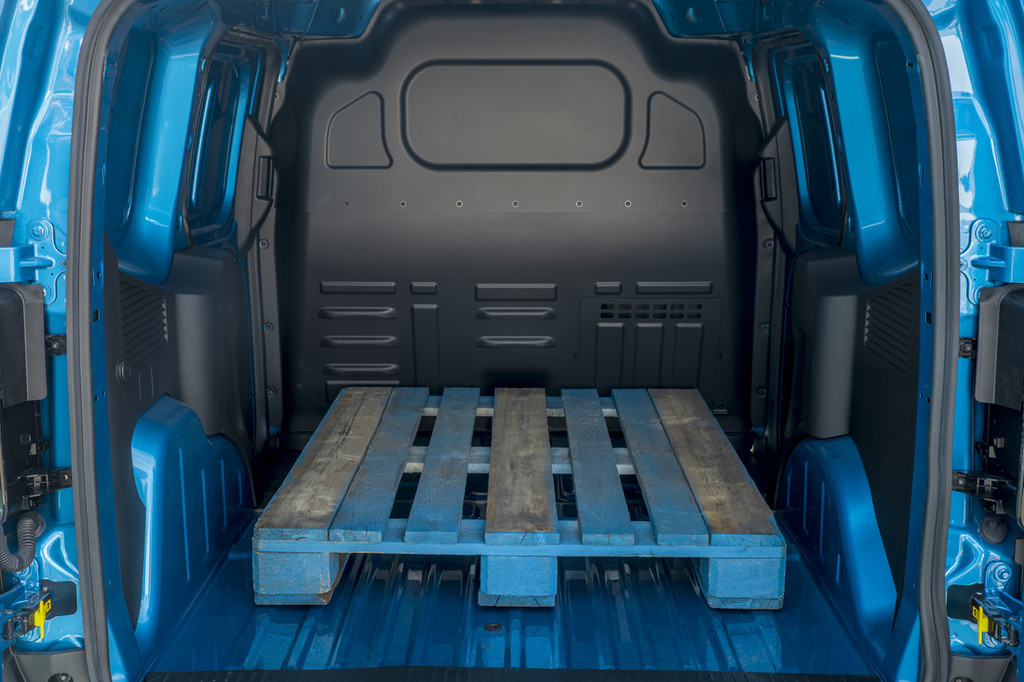 Popolnoma nova oblika karoserije modela E-Transit Courier zagotavlja več prostora za tovor v vseh dimenzijah. Širina med notranjimi obodi zadnjih koles meri 1220 mm, kar kompaktnemu dostavniku prvič omogoča prevoz dveh evropalet. Skupna prostornina tovornega prostora je zdaj 2,9 m3, kar je 25 odstotkov več kot pri predhodniku. Mogoče jo je še povečati z uporabo nove funkcije predelne stene, ki uporabnikom omogoča prevoz predmetov, kot so deske ali cevi, daljše od 2600 mm.
