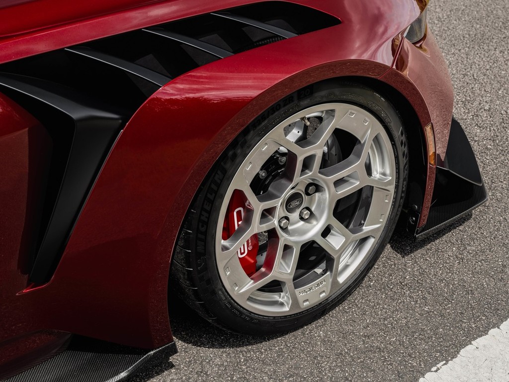 Mustang GTD v Le Mansu vzbuja občudovanje tudi z novo barvo Chroma Flame. Ta je ena od šestih serijskih barv za Mustanga GTD – poleg Polymimetic Gray, Race Red, Shadow Black, Frozen White in Lightning Blue – in je ekskluzivno na voljo samo z Mustangom GTD. Temen bordo odtenek se lepo ujema z oblogami različice Carbon Series. Različica Carbon Series poudarja karoserijo iz ogljikovih vlaken, zato pokrov motorja, streha in zadnji pokrov Tech Deck niso pobarvani, platišča (aluminijasta ali