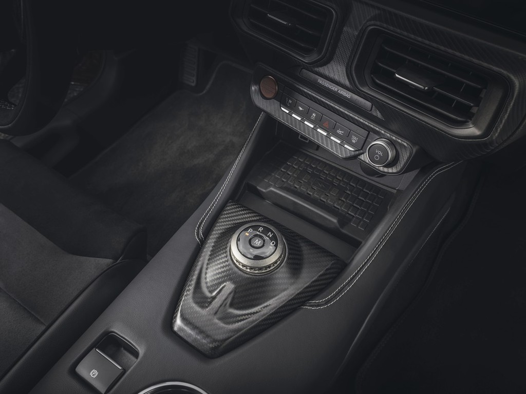 Poleg tega sta dva nova gumba na ploskvi pred vrtljivim izbirnikom prestave. Z njima lahko voznik izbere možnosti načina za vožnjo po dirkališču in aktivira funkcijo za dvig sprednje osi, ki pomaga pri izogibanju oviram na parkiriščih in dovozih. Vozniki imajo tudi večji nadzor nad tem, kako serijski osemstopenjski menjalnik z dvojno sklopko upravlja s ciljnimi 800 konjskimi močmi 5,2-litrskega motorja V8 s tlačnim polnilnikom (‘supercharger’). To jim omogočata večji 3D-natisnjeni obvolanski ročici iz titana s posebnim šestkotnim vzorcem, ki sta lahki in voznikovim prstom omogočata dober oprijem – še en primer Fordove uporabe tehnologije iz sveta dirk za izboljšanje vozniške izkušnje. Obloge iz titana so na voljo tudi na vrtljivem izbirniku prestav na sredinski konzoli.