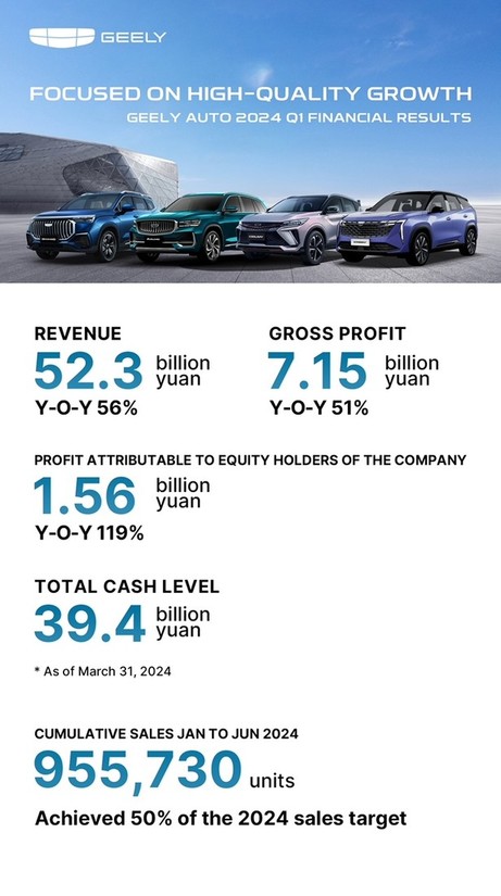 Skupina Geely Automobile Holdings Limited (0175.HK) – skrajšano Geely Auto Group – je objavila finančne rezultate za prvo četrtletje leta 2024. Prihodki skupine Geely Auto Group so po poročilih znašali 52,3 milijarde juanov, kar pomeni 56-odstotno povečanje v primerjavi s prvim četrtletjem leta 2023. Dobiček se je na letni ravni povečal za 119 % na 1,56 milijarde juanov.
