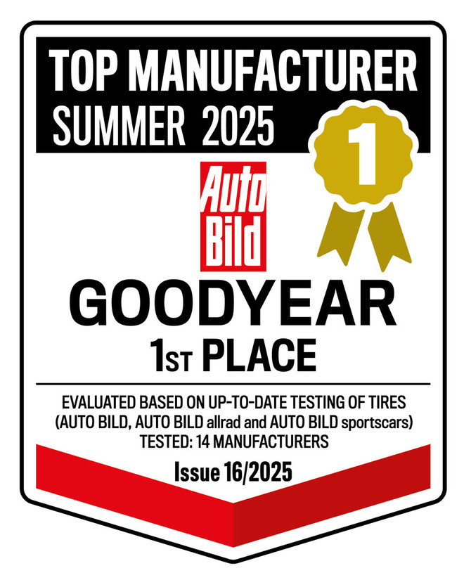 Legendarna pnevmatika Eagle F1 Asymmetric 6 je na testih osvojila dve zmagi in eno drugo mesto, model EfficientGrip 2 SUV pa je bil nagrajen s priznanjem »Green Tire« za okolju prijazno delovanje, ki ga podeljuje revija Auto Bild. Pnevmatika Eagle F1 Asymmetric 6 pa je osvojila tudi naziv »Eco-Master«, kar potrjuje Goodyearovo predanost trajnostnemu razvoju. Vsi ti uspehi so Goodyear uvrstili na sam vrh lestvice revije Auto Bild kot najboljšega proizvajalca letnih pnevmatik v letu 2025. Prestižno priznanje za najboljšega proizvajalca letnih pnevmatik je Goodyear prejel tretjič v zadnjih štirih letih[2]. V obrazložitvi so pri Auto Bildu zapisali: »Zaslužena zmaga – s tremi vrhunskimi uvrstitvami pnevmatike Eagle F1 Asymmetric, izvrstnim rezultatom modela EfficientGrip 2 ter dvema posebnima nagradama (Eco-Master in Green Tire) je Goodyear zasluženo vstopi v poletno sezono 2025 kot najboljši proizvajalec letnih pnevmatik.«