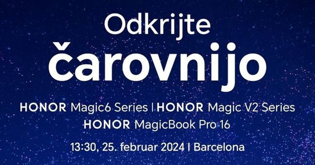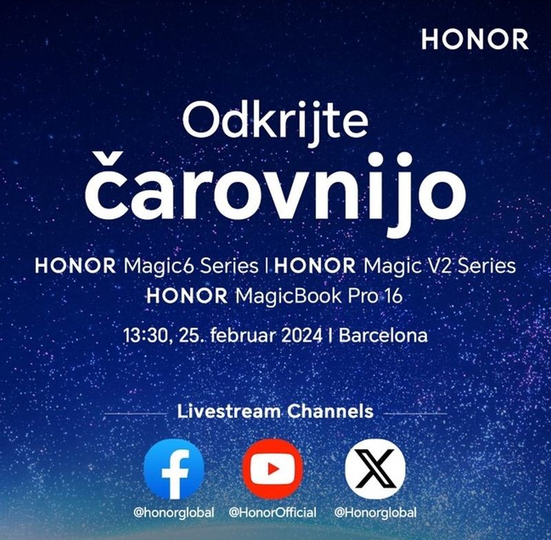 [Ljubljana, 23. februar 2024] To nedeljo, 25. februarja, s pričetkom ob 13.30 uri, bo globalna tehnološka znamka HONOR na sejmu MWC Barcelona predstavila nove pametne telefone. Na samem dogodku bo HONOR predstavil nove izdelke z vrsto inovacij z umetno inteligenco. Vsi zainteresirani lahko dogodek spremljate preko livestreama, ki bo na voljo na pristajalnih straneh in družbenih omrežjih spodaj, v trenutku začetka dogodka pa na tej odprti povezavi: https://www.hihonor.com/si/events/honor-mwc/