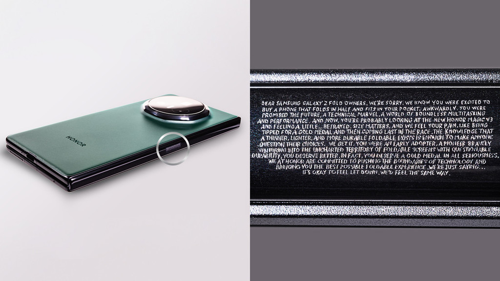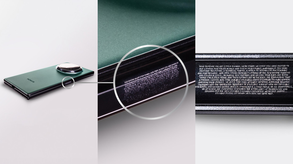 HONOR se zaveda težkega položaja, v katerega je postavil lastnike telefona Samsung Galaxy Z Fold, in se iskreno javno opravičuje za nevšečnosti, ki jih je povzročil tistim, ki so že kupili Samsungovo debelejšo alternativo. Zaradi morebitnega razočaranja, ki so ga lahko občutili Samsungovi kupci zaradi nakupa debelejšega in težjega preklopnega telefona pred lansiranjem HONOR-jeve vodilne naprave na trgu, je HONOR vdolž tečaja telefona Magic V3 vgraviral opravičilo z 813 znaki.