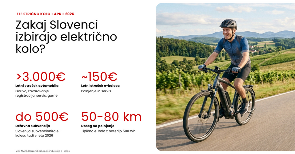 Vlada Republike Slovenije je v letu 2026 nadaljevala subvencijo za nakup določenih električnih koles, pri čemer lahko državljani prihranijo do 500 €. Naložba v e-kolo bi se tako lahko izkazala za pametno investicijo v času negotove situacije z gorivom. Po okvirnem izračunu lastnika avtomobila nižjega cenovnega razreda letno stane okoli 3.000 evrov, ko seštejemo gorivo, zavarovanje, registracijo, servis in pnevmatike. E-kolo srednjega razreda stane med 1.000 in 2.000 evrov pri nakupu, stroški uporabe pa se omejijo na polnjenje in osnovni servis; skupaj pod 150 evrov letno. Z državno subvencijo, ki je v veljavi, se investicija v primerjavi s stroški mestne vožnje z avtomobilom lahko pokrije zelo hitro.
