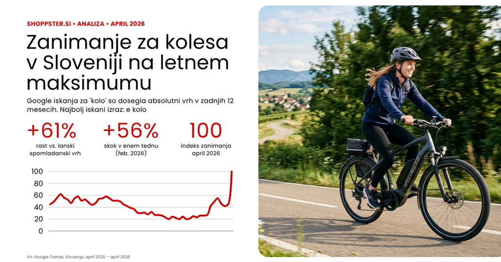 Medtem ko cene goriva redno naraščajo zaradi aktualnega konflikta na Bližnjem vzhodu, ljudje pa iščejo načine za prihranek pri vsakodnevnem prevozu, se je zanimanje za kolesa v Sloveniji v zadnjih dveh tednih povečalo za kar 61 odstotkov in doseglo letni vrhunec. To potrjujejo podatki spletnih iskalnikov, ki jih spremlja tudi platforma Shoppster.si. Google iskanja na to temo so dosegla absolutni maksimum v zadnjih 12 mesecih v začetku aprila, kar pomeni, da se je kolesarska sezona v Sloveniji začela precej prej kot običajno. K temu je prispevalo več dejavnikov, med katerimi so kot najbolj logični izpostavljeni vremenski, pa tudi ekonomski pogoji.