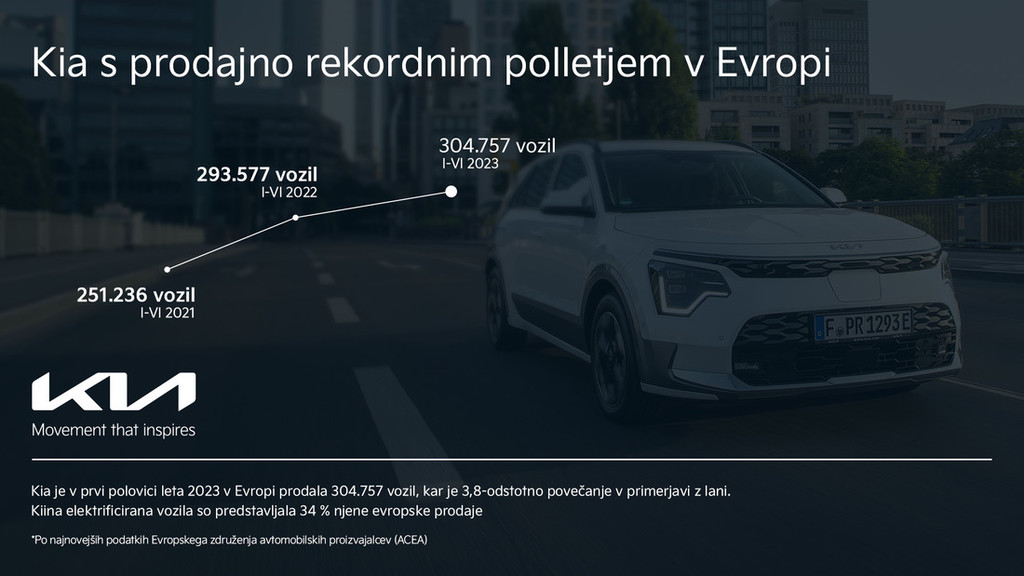 Po najnovejših podatkih Evropskega združenja avtomobilskih proizvajalcev (ACEA*) je Kia v prvi polovici leta 2023 v Evropi (Kia sem šteje države članice EU, Islandijo, Lihtenštajn, Norveško, Švico in Združeno kraljestvo) registrirala 304.757 vozil, kar pomeni, da je tudi v letu 2023 dosegla rekordne rezultate. To je 3,8-odstotno povečanje v primerjavi z enakim obdobjem leta 2022. Samo junija je bilo prodanih 54.611 vozil, kar je 5,4 % več kot junija lani. Kiin evropski tržni delež je v prvem polletju znašal 4,6 %.