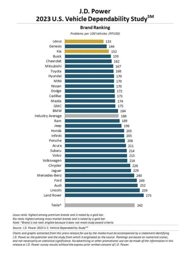 Študija preučuje težave, s katerimi so se v zadnjih 12 mesecih srečali lastniki tri leta starih vozil. Splošna zanesljivost je določena s številom prijavljenih težav na 100 vozil (PP100). Tako nižja ocena odraža višjo stopnjo zanesljivosti. Študija je bila sestavljena iz 30.062 izpolnjenih anket in je preučevala, kako vozila modelnega leta 2020 trenutno delujejo na področjih kakovosti, zamenjave komponent in privlačnosti.