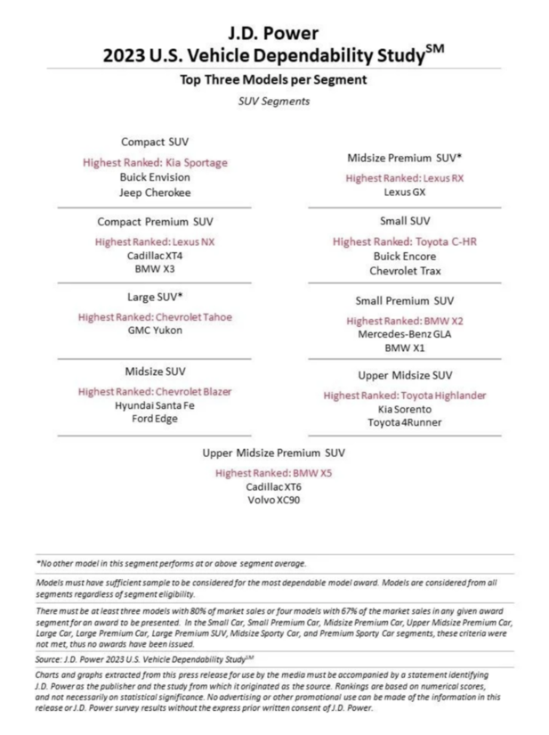 Kia je že tretje leto zapored številka ena med množičnimi znamkami v študiji J.D. Power VDS 2023 o zanesljivosti vozil (Vehicle Dependability Study), ki temelji na poročanju lastnikov o težavah s svojimi tri leta starimi vozili. Tej pomembni skupni zmagi je treba dodati še tri zmage v posameznih razredih, kjer so zmagali Forte (kompaktni avtomobil), Optima (srednje velika limuzina) in Sportage (kompaktni SUV). Najnovejši dosežek še naprej krepi Kiin sloves avtomobilista, ki proizvaja najbolj