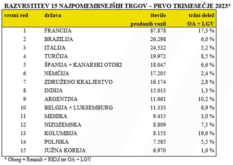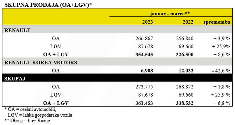 Ob vztrajanju pri komercialni politiki, ki je osredotočena na ustvarjanje vrednosti, je skupna prodaja znamke Renault v prvem četrtletju letošnjega leta dosegla 354.545 prodanih vozil (osebnih avtomobilov in lahkih gospodarskih vozil), kar je za 9 odstotkov več kot v prvem četrtletju 2022. V Evropi je znamka Renault dosegla 6,2-odstoten tržni delež (za 0,2 odstotne točke več kot v prvem četrtletju 2022) ob prodaji 231.125 vozil (OA in LGV). Enako kot leta 2022 je znamka znatno napredovala v segmentih z višjo dodano vrednostjo – na rastočem trgu elektrificiranih vozil***, v segmentu C, v prodaji posameznikom in na trgu lahkih gospodarskih vozil.