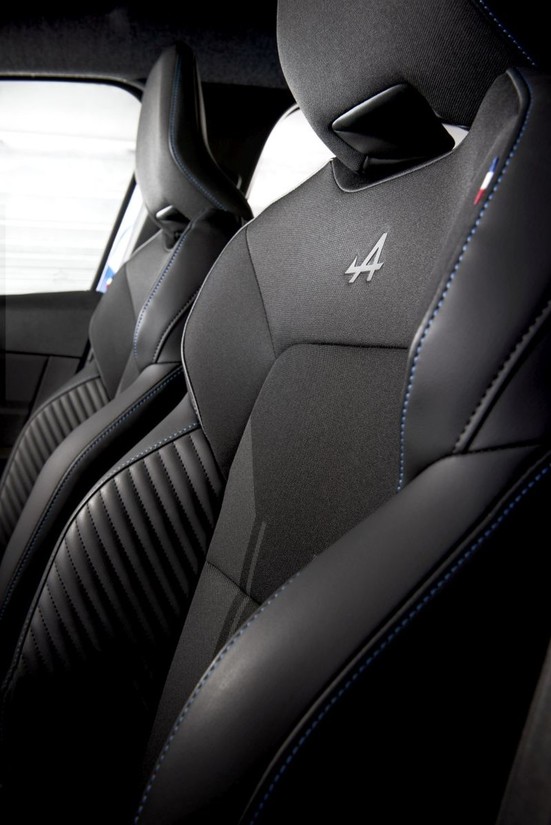 sedežih, ki spominja na športne majice. To športno notranjščino dopolnjujejo modri okrasni šivi in na zgornjem delu sedežnih naslonov vroče natisnjen puščičasti A znamke Alpine. Na straneh sedežev je všita modro-belo-rdeča zastavica, simbol Francije.